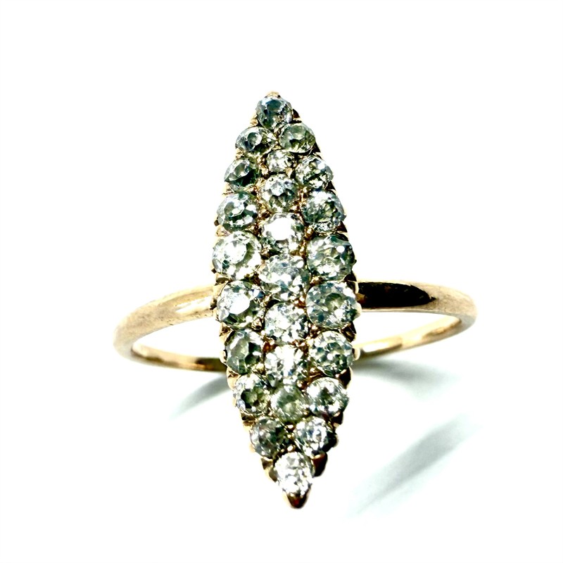 Půvabný zlatý prsten s brilianty. Šperk byl vyroben ze zlata růžového odstínu ryzosti 560/1000. Hlava prstenu je celá osázená brilianty starého brusu. Jedná se o 25 přírodních briliantů pyšnících se vysokou brilancí. Celková váha šperku 2,16 g. Velikost 55. Perfektní stav.