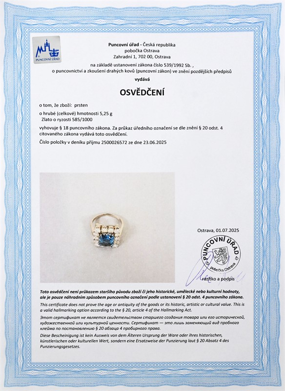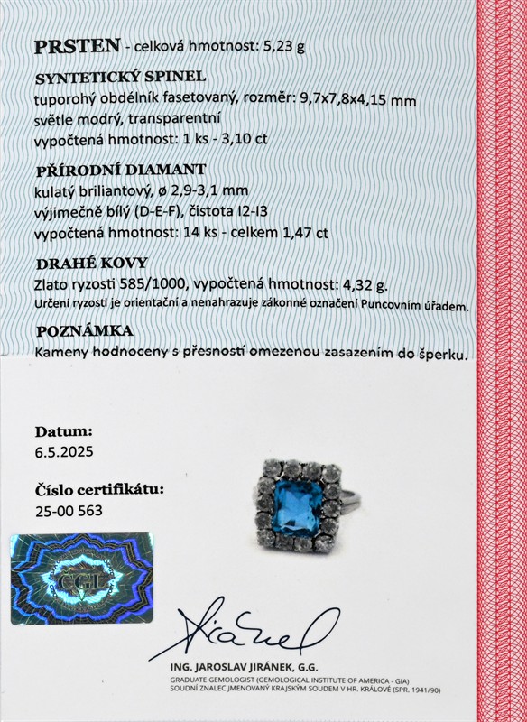 zlato o ryzosti 585/1000 váha 5,23 g míry hlavy 1,5 x 1,3 cm syntetický spinel 3,10 ct přírodní diamant – celkem 1,47 ct, výjimečně bílý (D-E-F), čistota I2-I3 velikost 49 osvědčení puncovního úřadu certifikát z gemologické laboratoře je součástí šperku