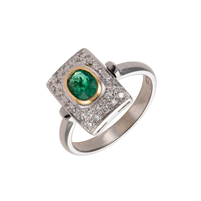 Materiál: bílé zlato o ryzosti 585/1000 Hmotnost: 6,35 g Rozměry: velikost prstenu 55, míry hlavy 1,3 x 0,9 cm Drahokamy: • oválný zkosený smaragd, celková hmotnost cca 0,52 ct • 22 ks přírodních diamantů, celková hmotnost 0,23 ct, briliantový brus, barva Wesselton, čistota SI Stav: výborný Doklady: • osvědčení Puncovního úřadu České republiky