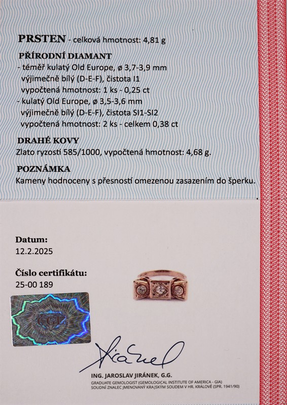 Žluté zlato o ryzosti 585/1000 váha 4,81 g přírodní diamant Old Europe 1 ks 0,25 ct, výjimečně bílý (D-E-F), čistota I1 přírodní diamant Old Europe 2 ks 0,38 ct, výjimečně bílý (D-E-F), čistota SI1-SI2 velikost prstenu 58 míry hlavy 2,2 x 0,8 cm r. 1930 puncované platným puncem certifikát z gemologické laboratoře je součástí šperku