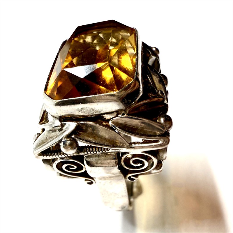 Výrazný, elegantní prsten z bílého zlata. Šperk byl vyroben v první polovině 20.století ze zlata ryzosti 333/1000, váha 7,99g. Šperku vévodí tmavě žlutý citrín fazetového brusu. Drahý kámen je vsazen do velmi detailně zdobené, efektní hlavice. Velikost 55. Velmi málo nošeno, profesionálně vyčištěno. Perfektní stav.