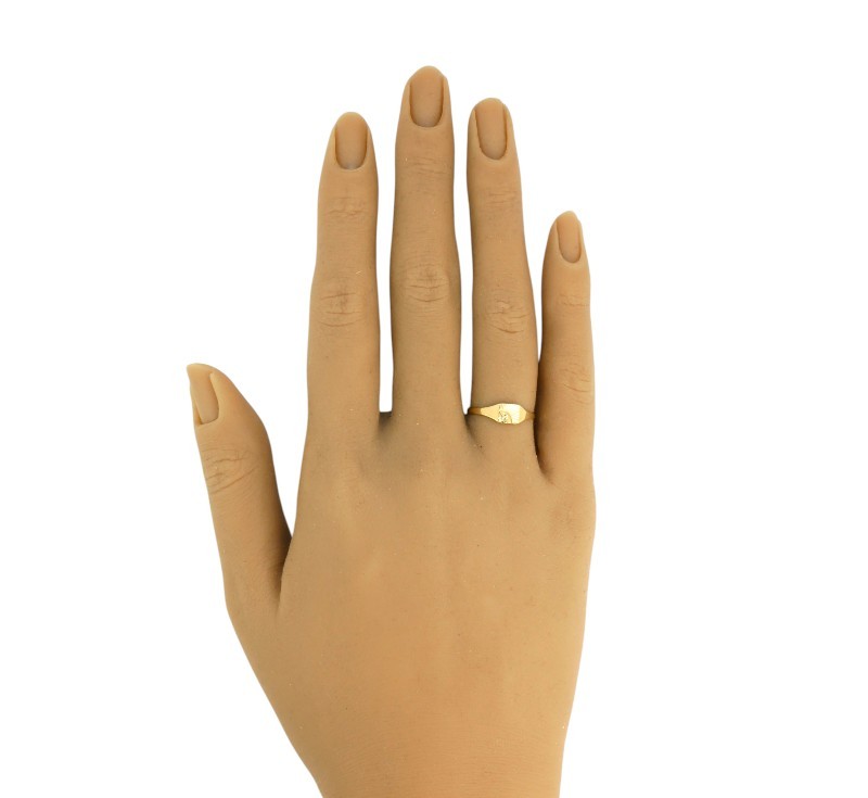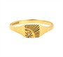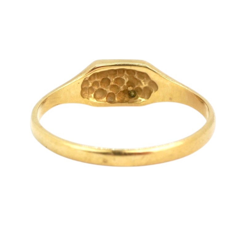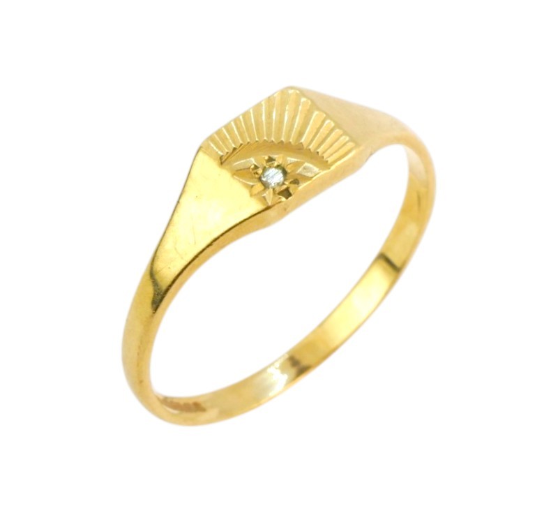 Prsten vyrobený ze zlata ryzosti 375/1000 hlava prstenu je zdobena jemným paprskovitým rytím, které evokuje motiv vycházejícího slunce ve jeho středu je osazen drobný diamant. Anglické puncy. Velikost 49. Hmotnost 1,04 g.