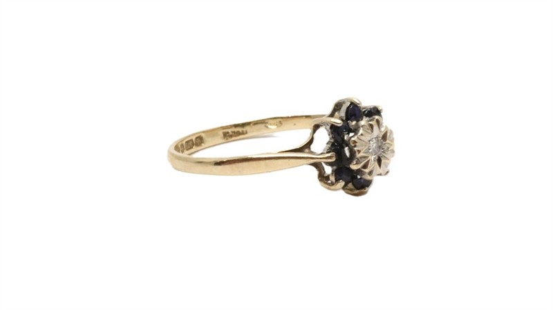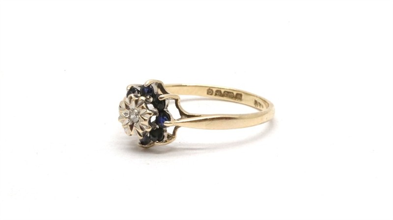 Zlatý prsten s diamantem a safíry. Žluté zlato 375/1000. Přírodní safíry, celková váha 0,24 ct. Přírodní diamant, kvalita I1, barva I - J, celková váha 0,015 ct. Váha prstenu: 1,29 g. Velikost prstenu: 49,5.