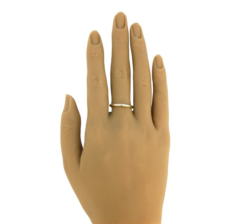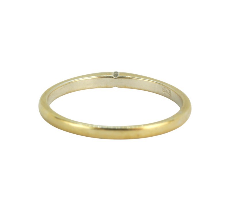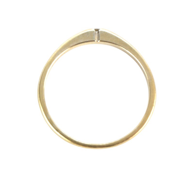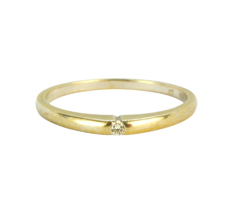 Jednoduchý prsten vyrobený ze zlata ryzosti 750/1000 (punc kohout) s diamantem hmotnosti 0,005 ct. Velikost 59. Celková hmotnost 2,30 g.