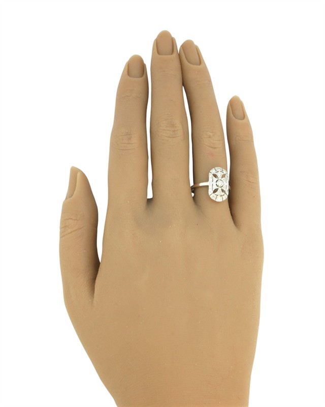 Prsten z bílého zlata ryzosti 585/1000 s diamanty briliantového brusu o celkové hmotnosti 0,30 ct. Celková hmotnost prstenu je 2,85 g. Velikost 54.