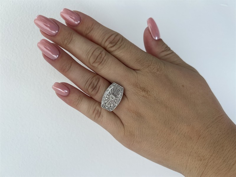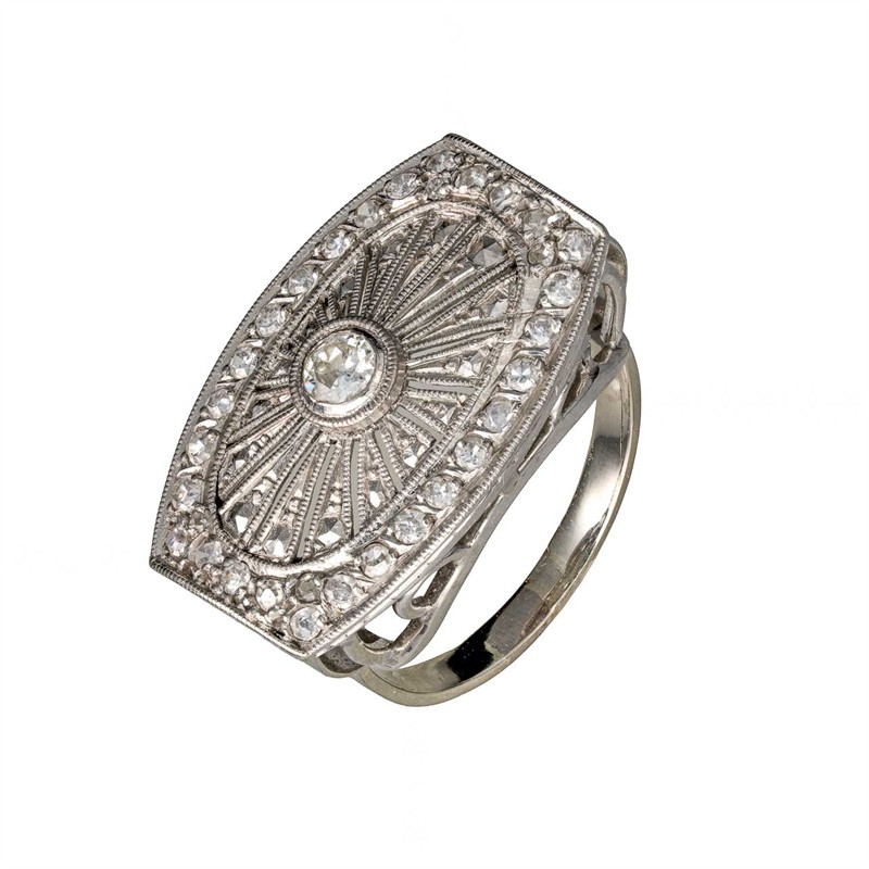 zlato o ryzosti 585/1000 váha 4,5 g míry hlavy 2,2 x 1,4 cm přírodní diamant 1 ks 0,12 ct, 32 ks 0,38 ct, dohromady 0,50 ct, výjimečně bílý (D-E-F), čistota SI2 / SI1,SI2,I1 velikost 52 výborný stav osvědčení puncovního úřadu certifikát z gemologické laboratoře je součástí šperku
