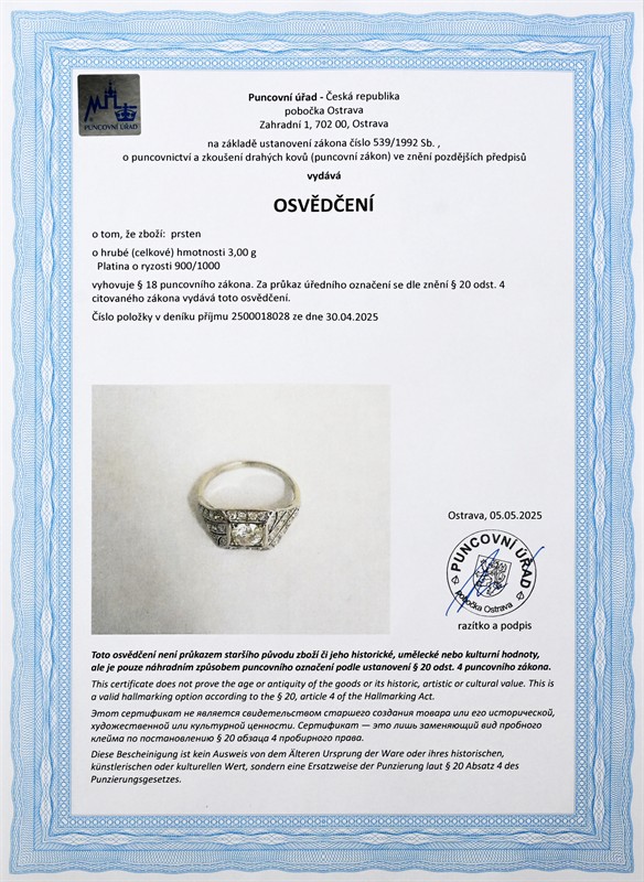 platina o ryzosti 900/1000 váha 3,02g míry hlavy bez boční strany 1 x 0,8 cm přírodní diamant 1 ks 0,60 ct, vzácně bílý (D-E-F), čistota I1, diamanty 26 ks 0,43 ct, vzácně bílý (D-E-F), čistota SI1-SI2-I1-I2 velikost 51-52 výborný stav osvědčení puncovního úřadu certifikát z gemologické laboratoře je součástí šperku
