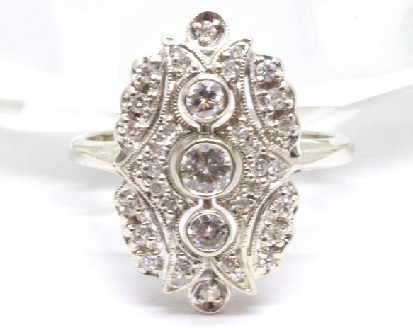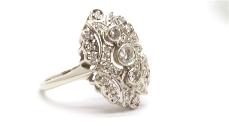 Zlatý prsten s diamanty. Bílé zlato 585/1000. Přírodní diamanty, kvalita VS2 - SI2, barva H - I, celková váha 0,7 ct. Váha prstenu: 5,45 g. Velikost prstenu: 59.