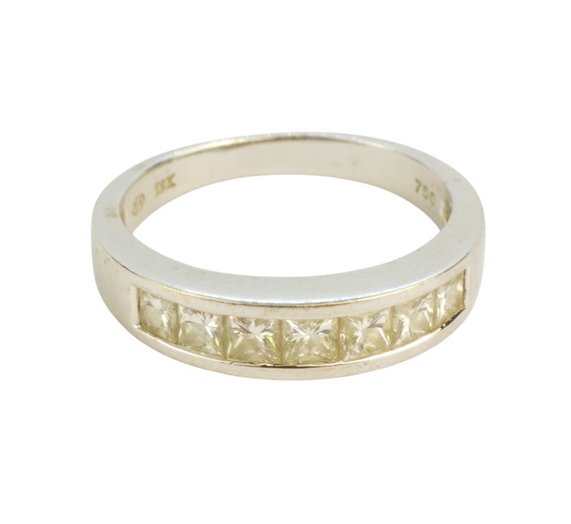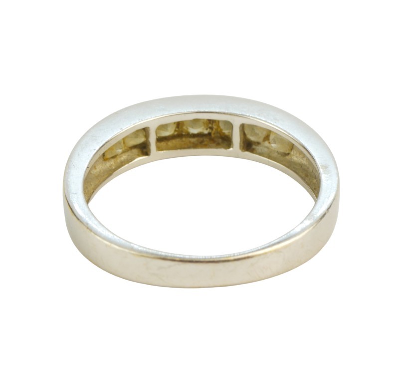 Prsten vyrobený z bílého zlata ryzosti 750/1000 zdobí sedm diamantů celkové hmotnosti 0,35 ct. Velikost prstenu 54, celková hmotnost 3,50 g.
