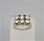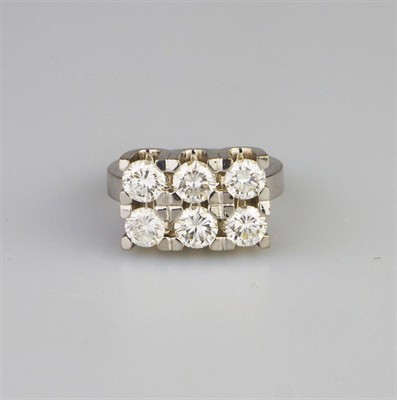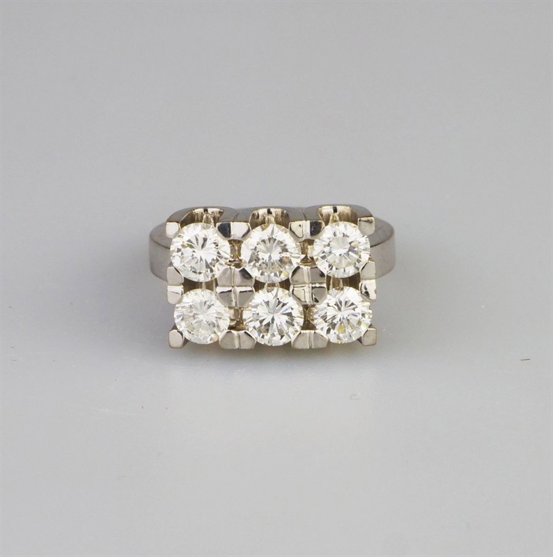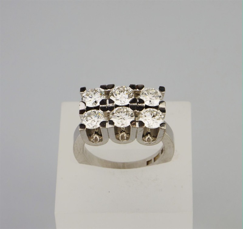 robustní prsten z bílého zlata se 6 diamanty briliantového brusu, Au 14,69 g/750/000, diamanty o celkové hmotnosti 3,03 ct, z toho 0,50 + 0,55 + 0,46 + 0,48 + 0,52 + 0,52, čistota VS1 + VVS2 + Si2 + Si1 + P1 + VVS1, barva H-I-J, Švédsko, kolem r. 1995, individuální zakázková práce, pozdější český punc (kohout), rozměry 2,53 x 2,21 x 1,17 cm; velikost prstenu 55; znalecký posudek,