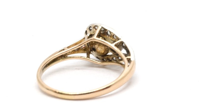 Zlatý prsten s diamanty a perlou. Žluté zlato 650/1000, stříbro 995/1000. Přírodní diamanty - starý brus, kvalita SI1 - SI2, barva H - J, celková váha 0,22 ct. Kultivovaná perla. Váha prstenu: 2,59 g. Velikost prstenu: 54. Osvědčení puncovního úřadu.