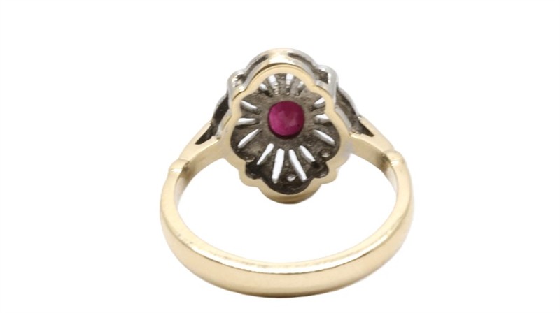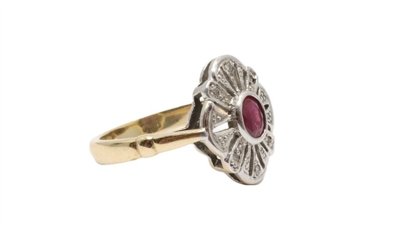 Zlatý prsten s diamanty a rubínem. Žluté a bílé zlato 375/1000. Přírodní rubín 0,35 ct. Přírodní diamanty, kvalita SI2 - I1, barva H - I, celková váha 0,05 ct. Váha prstenu: 3,21 g. Velikost prstenu: 52.