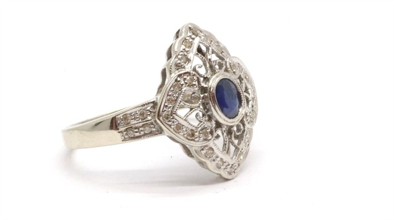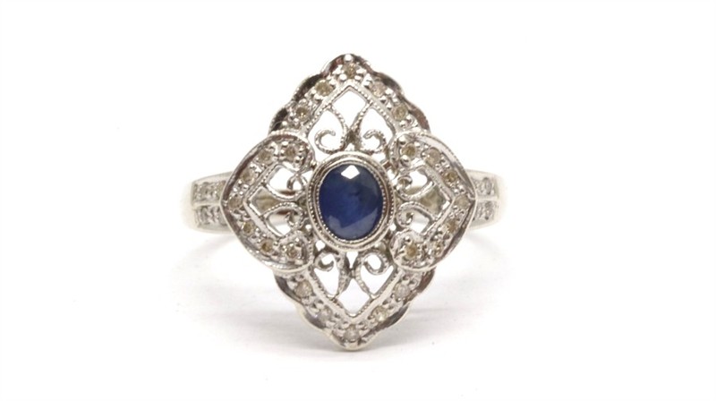 Zlatý prsten s diamanty a safírem. Bílé zlato 375/1000. Přírodní safír 0,35 ct. Přírodní diamanty, kvalita SI2 - I1, barva I - J, celková váha 0,18 ct. Váha prstenu: 3,11 g. Velikost prstenu: 60.