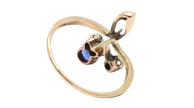 Zlatý prsten s diamanty a safírem. Žluté a bílé zlato 585/1000. Přírodní safír 0,4 ct. Přírodní diamanty - starý brus, kvalita SI1 - I1, barva H - J, celková váha 0,25 ct. Váha prstenu: 2,95 g. Velikost prstenu: 57.