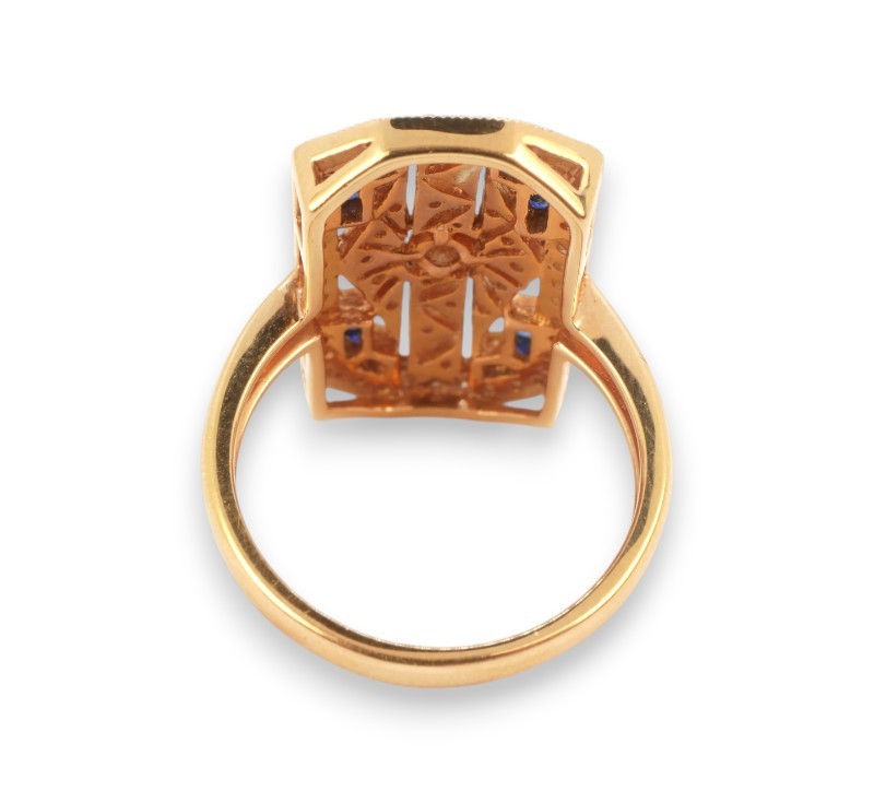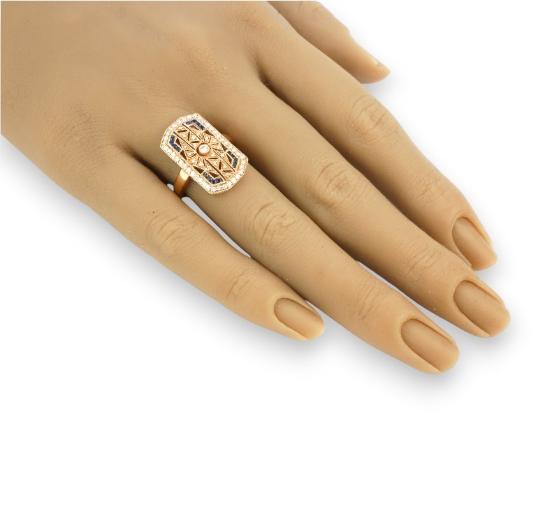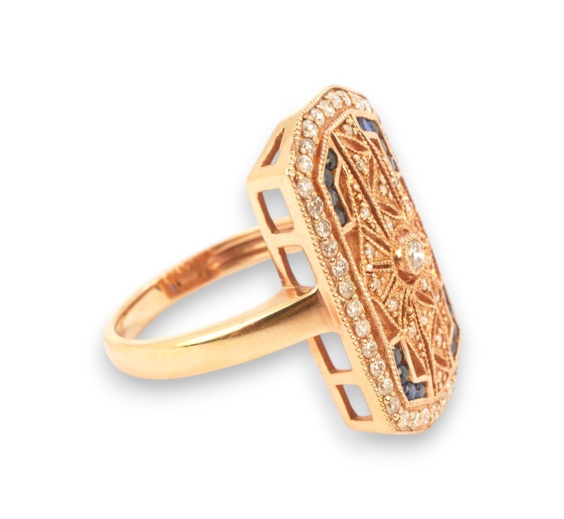 Prsten v art deco tvarosloví z růžového zlata ryzosti 585/1000 osazený safíry a diamanty briliantového brusu o celkové hmotnosti 0,38 ct (SI2/H). Celková hmotnost prstenu je 5,60 g. Velikost 54.