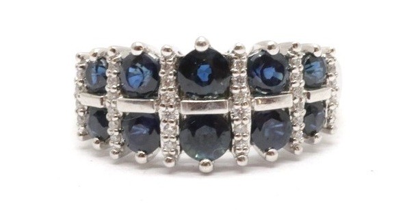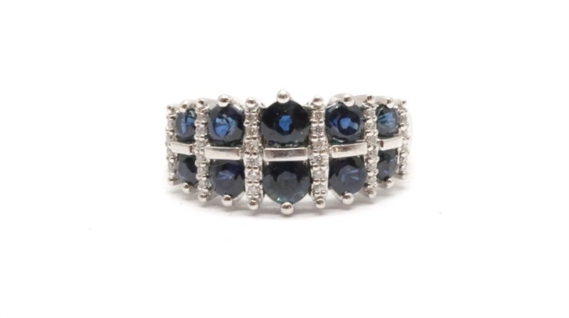 Zlatý prsten s diamanty a safíry. Bílé zlato 375/1000. Přírodní safíry, celková váha 1,2 ct. Přírodní diamanty, kvalita SI1 - SI2, barva H - I, celková váha 0,12 ct. Váha prstenu: 4,14 g. Velikost prstenu: 55.