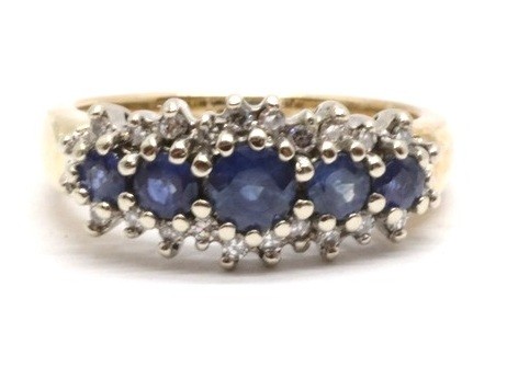 Zlatý prsten s diamanty a safíry. Bílé a žluté zlato 375/1000. Přírodní safíry, celková váha 0,55 ct. Přírodní diamanty, kvalita SI1 - SI2, barva H - I, celková váha 0,2 ct. Váha prstenu: 3,74 g. Velikost prstenu: 53.