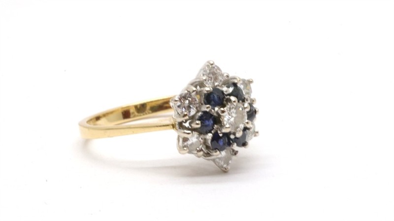 Zlatý prsten s diamanty a safíry. Bílé a žluté zlato 750/1000. Přírodní safíry, celková váha 0,4 ct. Přírodní diamanty, kvalita SI1 - SI2, barva H - I, celková váha 0,6 ct. Váha prstenu: 3,81 g. Velikost prstenu: 54.