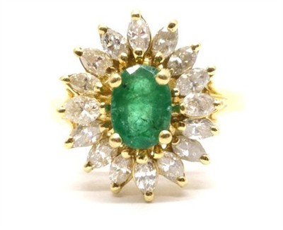 Zlatý prsten s diamanty a smaragdem. Žluté zlato 750/1000. Přírodní smaragd. celková váha 0,74 ct. Přírodní diamanty, kvalita SI1 - SI2, barva H - I, celková váha 0,95 ct. Váha prstenu: 5,01 g. Velikost prstenu: 53.