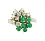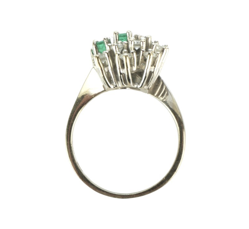 Prsten z bílého zlata ryzosti 585/1000 (punc labuť) s diamanty (cca 0,40 ct) a smaragdy. Velikost prstenu 56.Celková hmotnost 5,46 g.