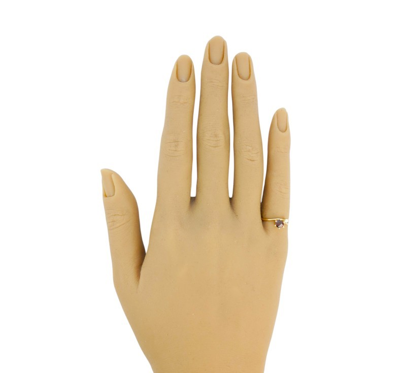 Drobný prsten ze zlata ryzosti 585/1000 zdobený granátem a kubickou zirkonií. Mistrovská značka FPG. Malá velikost 47, na malíček. Celková hmotnost 1,40 g.
