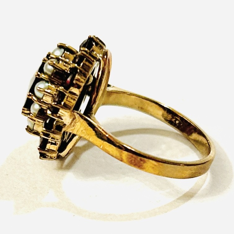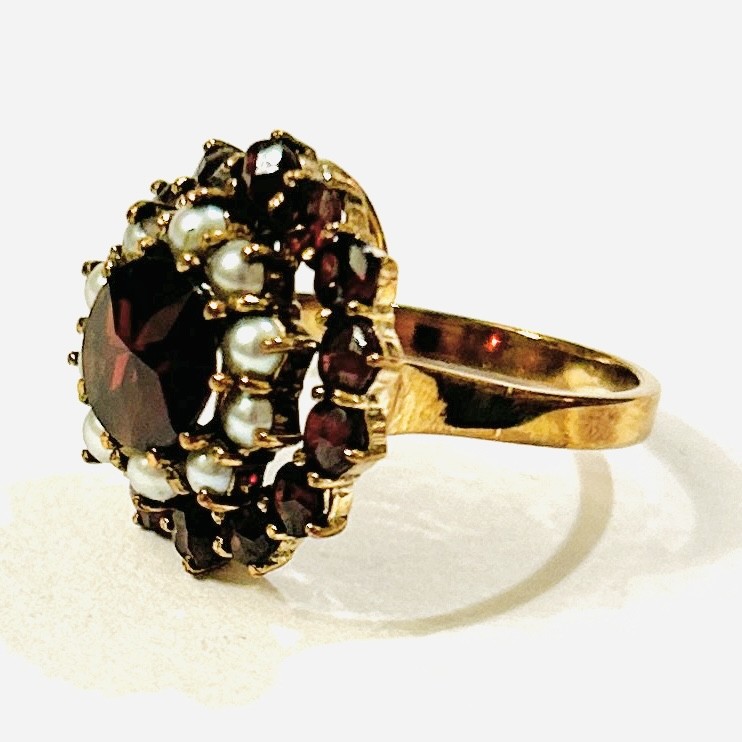 Honosný prsten s hlavicí připomínající kulatý květ, ve středu a při okraji osazeno přírodními granáty kulatého hvězdicového brusu, kontrastní kruh s přírodních bílo-šedých perel (půlperly), fasováno krapnami. Kvalitní německá zlatnická práce z 50. let 20. století. Zhotoveno z narůžovělého žlutého 8 karátového zlata, tj. o ryzosti 333/1000; nově opatřeno punc Z-59 (písmeno Z s květinou) a ryzostní číslo zevnitř šíny. Hmotnost 5,07 g, velikost 55, průměr hlavice 17 mm. Ve velmi zachovalém stavu, odborně vyčištěno a vyleštěno zlatníkem.