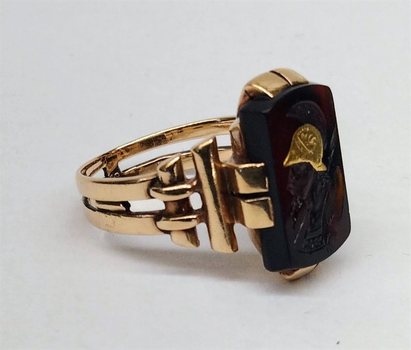 Zlatý prsten s mistrnou intaglií portrétu starořeckého hrdiny se zlatou přilbicí a zbrojí. Celková hmotnost Au 6,83 g/580/1000, otřelý punc liška (Z-27). nečitelná značka výrobce. Nádherná zlatnická práce. Rakousko-Uhersko, konec 19. století, rozměry hlavy prstenu 1,7 x 1,3 cm, velikost prstenu 56,5.