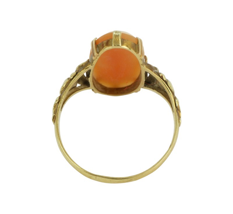 Prsten ze zlata ryzosti 585/1000 zdobený oválnou kamejí. Velikost prstenu 56. Rozměr hlavy prstenu 1,8 x 0,8 cm. Celková hmotnost 2,52 g.