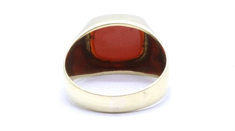 Zlatý prsten s karneolem. Žluté zlato 585/1000. Přírodní karneol. Váha prstenu: 5,72 g. Velikost prstenu: 56.