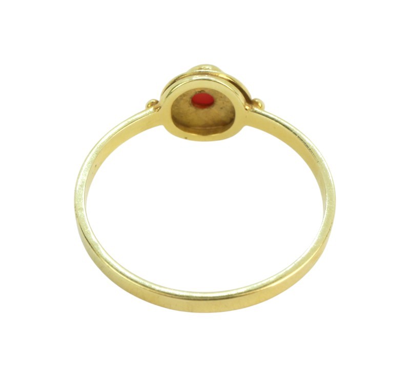Prsten ze žlutého zlata ryzosti 585/1000 (punc labuť) zdobený korálem. Velikost 54, celková hmotnost 1,50 g.