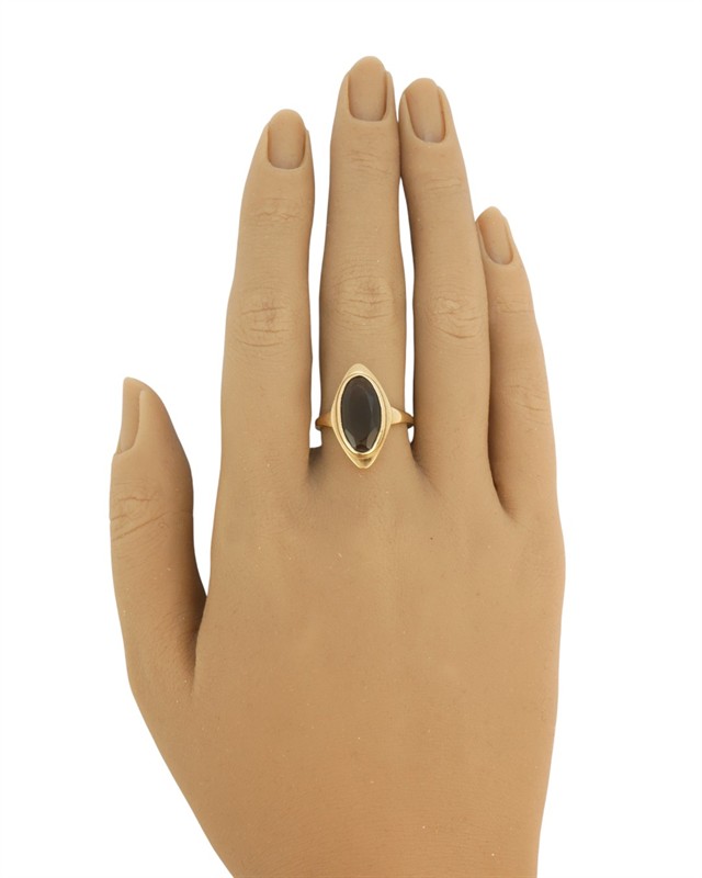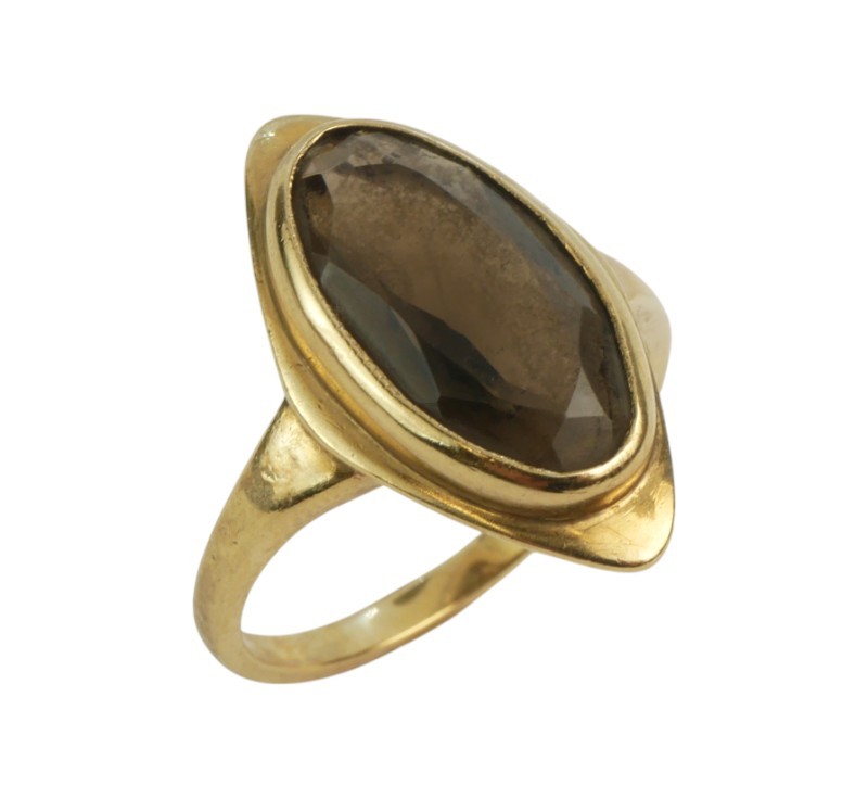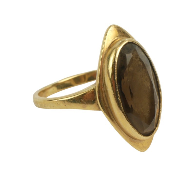 Zlatý prsten s hlavou ve tvaru loďky zdobenou kouřovým topazem. Zlato ryzost 37/5/1000, hmotnost prstenu 4,59 g. Velikost 56.