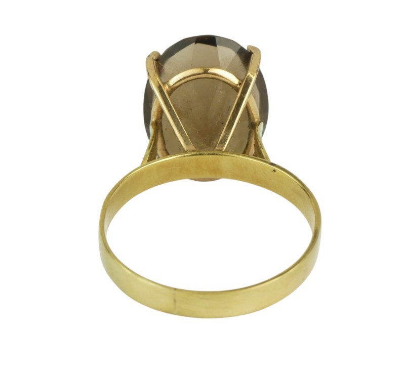 Prsten ze žlutého zlata dvou ryzostí 550 a 680/1000 zdobí kouřový topaz. Celková hmotnost prstenu 5,20 g. Velikost 61. Vyhotoveno osvědčení Puncovního úřadu.