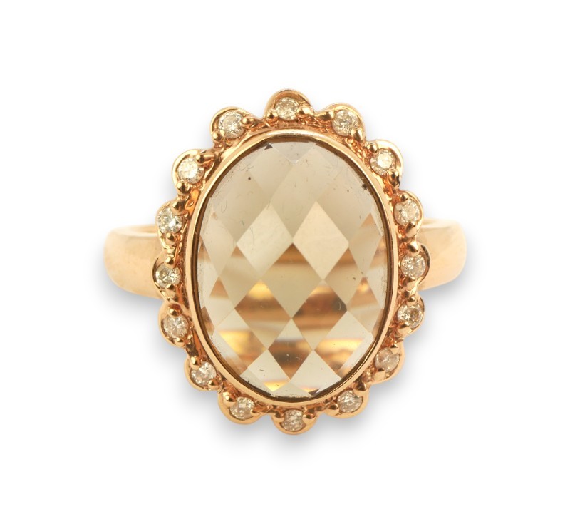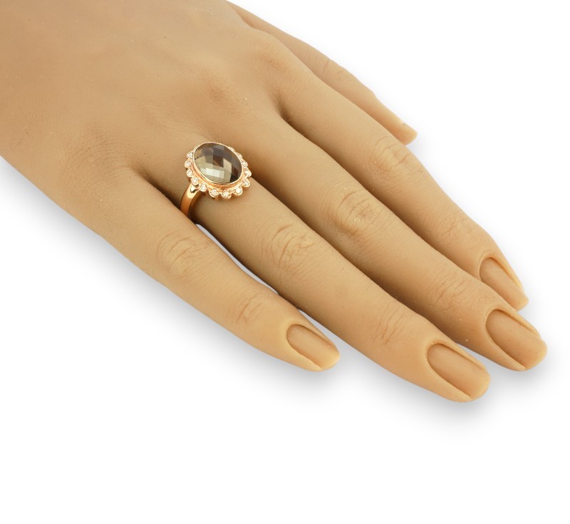 Prsten z růžového zlata ryzosti 585/1000 osazený kouřovým topazem o hmotnosti 4,47 ct a diamanty briliantového brusu o celkové hmotnosti 0,17 ct. Celková hmotnost prstenu je 5,28 g. Velikost 54.