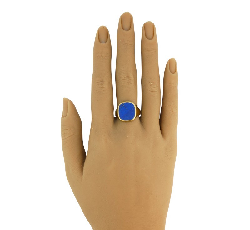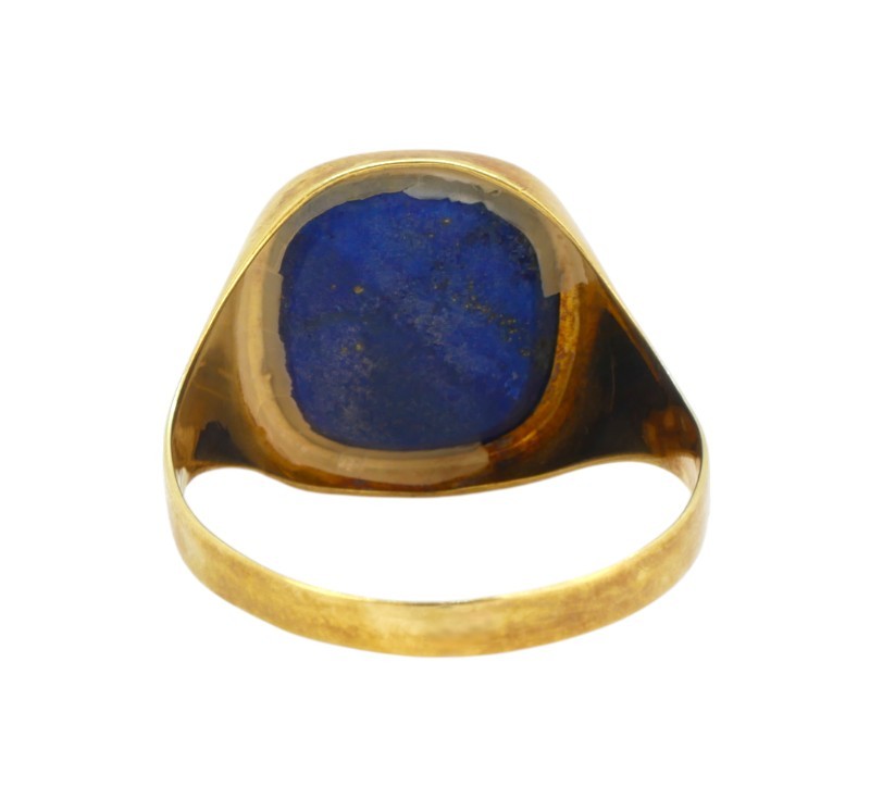 Prsten vyrobený ze žlutého zlata ryzosti 585/1000. Dominantou šperku je broušená destička přírodního lapis lazuli (lazuritu) intenzivní královské modři s jemnými inkluzemi zlatavého pyritu, připomínajícími noční oblohu. Rozměry hlavy prstenu 1,6 x 1,4 cm. Velikost 67, hmotnost 3,35 g. Tento typ prstenu byl v historii symbolem společenského postavení a dodnes zůstává vyhledávaným sběratelským kouskem i stylovým doplňkem pro náročné muže.