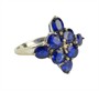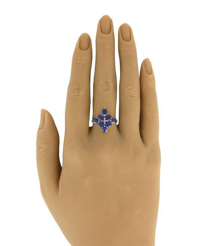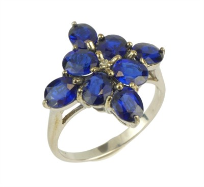 Moderní prsten s hlavicí stavěnou na ose řeckého kříže, osazeno přírodními modrými safíry oválného briliantového brusu o celkové váze 3,60 ct (0,045 ct - 8 ks), kvalita velmi dobrá, ve středu doplněno přírodním diamantem kulatého jednoduchého brusu (achtkant) o váze 0,005 ct. Pečlivě fasováno krapnami na hlavici s průsvitkami. Kvalitní birminghamská zlatnická práce z první pětiny 21. století. Zhotoveno z bílého 9 karátového zlata, tj. o ryzosti 375/1000; britské puncovní značení, ryzostní číslo a mistrovská značka "R&C" zevnitř šíny. Hmotnost 3,50 g, velikost 55, délka a šířka hlavice 19 mm. Ve velmi zachovalém stavu, odborně vyčištěno a vyleštěno zlatníkem. Součástí odborný posudek (zabývající se pouze modrými safíry).