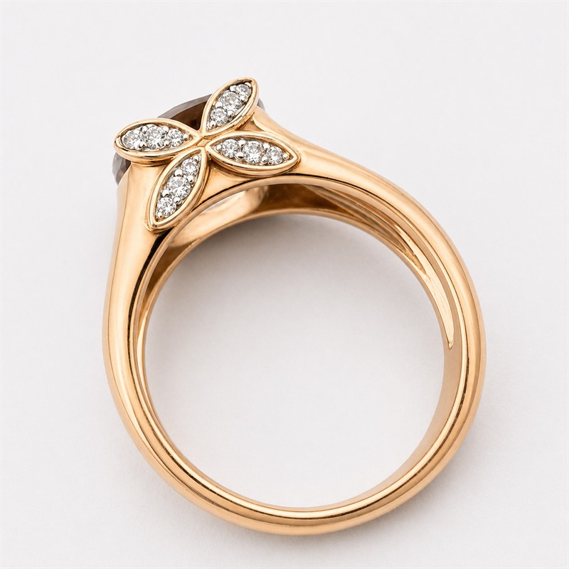 Půvabný,elegantní prsten ze zlata růžového odstínu. Šperk byl vyroben z masivního zlata ryzosti 375/1000. Celková váha 4,45 g Šperk je osazen jiskrnným,mistrně vybroušeným morganitam jemného fialovorůžového odstínu. Drahý kámen je přírodního původu. Šína je nevšedně v horní části zdobena plastickým květem osazeným čirými kameny briliantového brusu. Velikost 53,5 . Perfektní stav.