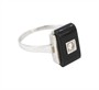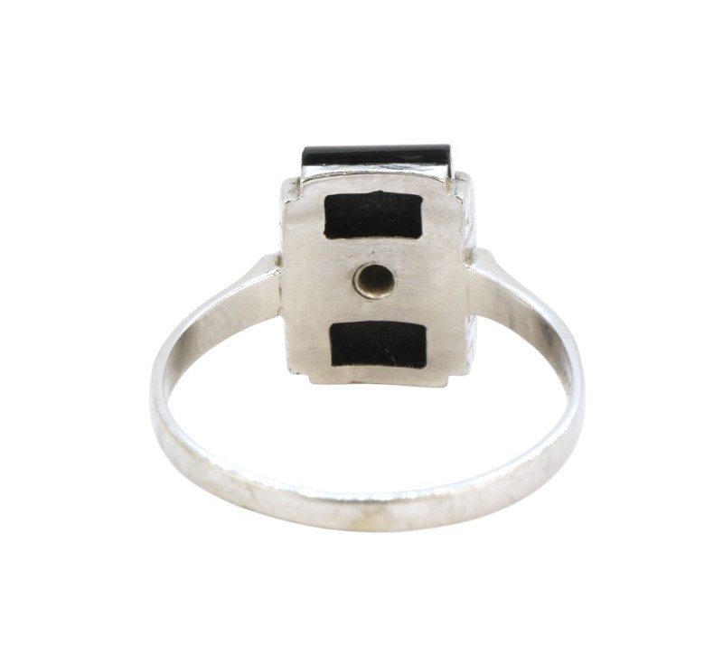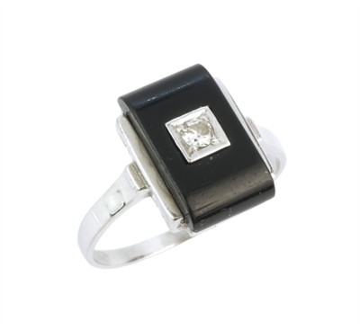 Prstren z bílého zlata ryzosti 750/1000 zhdobí obdélníkový plátek onyxu, v jehož středu je zasazen drobný přídoní diamant briliantového brusu a hmotnosti 0,05 ct. Velikost prstenu 55, celková hmotnost 2,84 g. Nadčasový šperk příjemného geometrického tvarosloví.