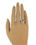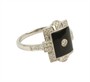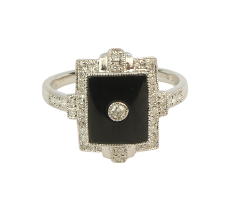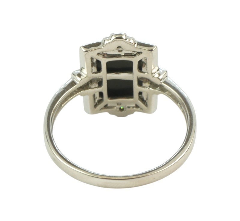Prsten z bílého zlata ryzosti 585/1000 s onyxem a diamanty briliantového brusu o celkové hmotnosti 0,20 ct. Celková hmotnost prstenu je 3,06 g. Velikost 53.