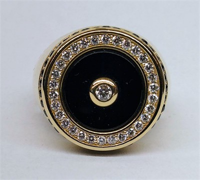 Zlatý masivní prsten s onyxem a diamanty briliantového brusu velmi dobré kvality o hmotnosti cca 0,40 ct. Celková hmotnost Au 9,48 g/585/1000, punc, ryzostní číslo, značka výrobce MA. Kvalitní solidní nenošený šperk. Německo, poslední čtvrtina 20. století, velikost prstenu 66.