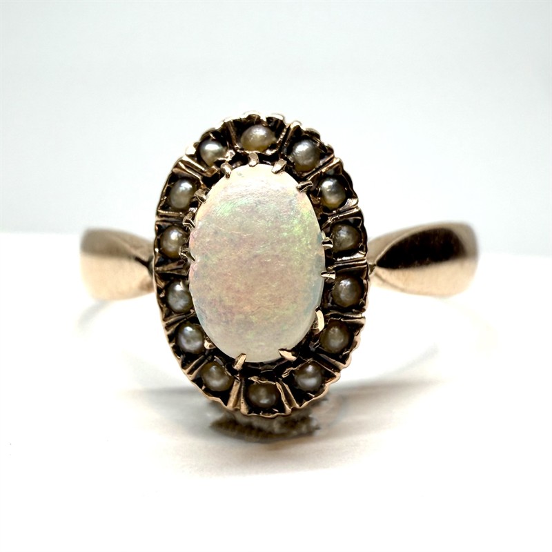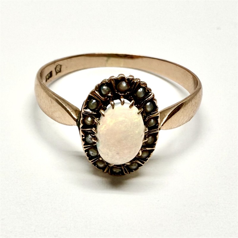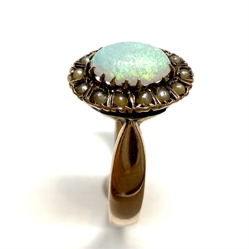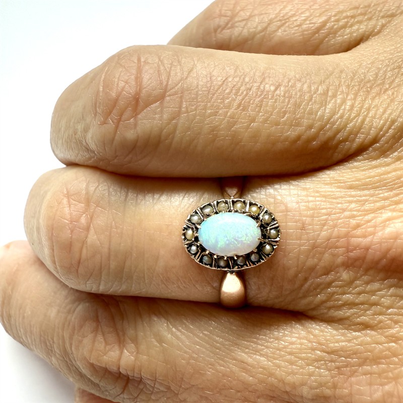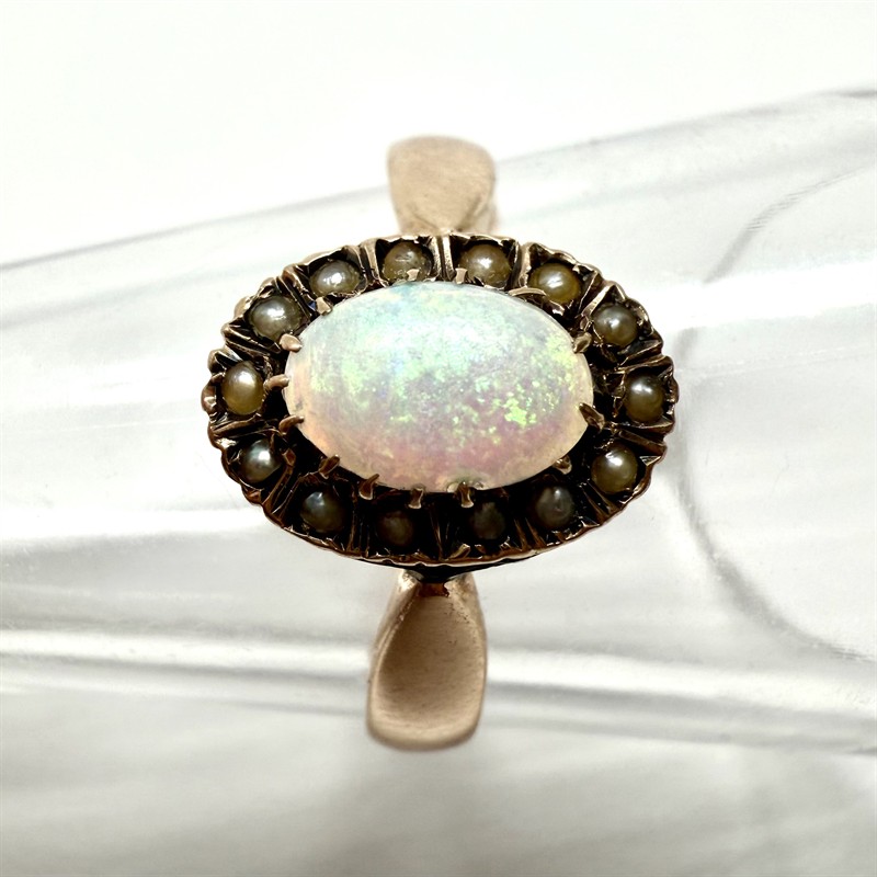 Půvabný, velmi starý, jemný prsten. Šperk byl vyroben ze zlata růžového odstínu ryzosti 333/1000. Váha prstenu 1,87 g. Šperk zdobí centrální opál jemně zarámovaný velmi drobnými, říčními perlami. Kámen má krásné tyrkysové odlesky s vysokou opalizací. Velikost 61. Ryzostní, puncovní a autorská značky. Perfektní stav.
