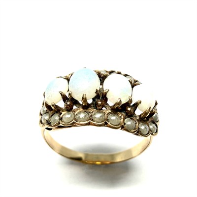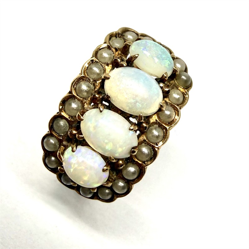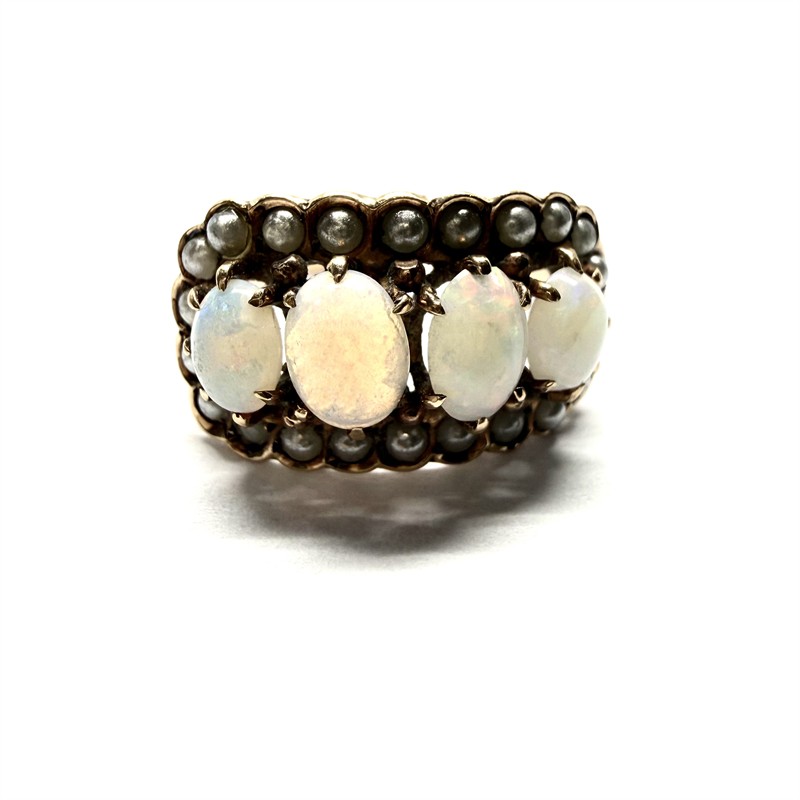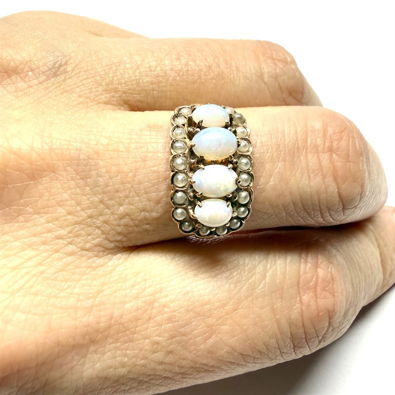 Mimořádně půvabný, velmi starý prsten. Zhotoven ze zlata sytého odstínu ryzosti 407/1000. Osvědčení Puncovního úřadu. Prsten zdobí čtyři opály krásného červánkového odstínu zarámované drobnými říčními perlami. Váha 2,28 g. Velikost 53.