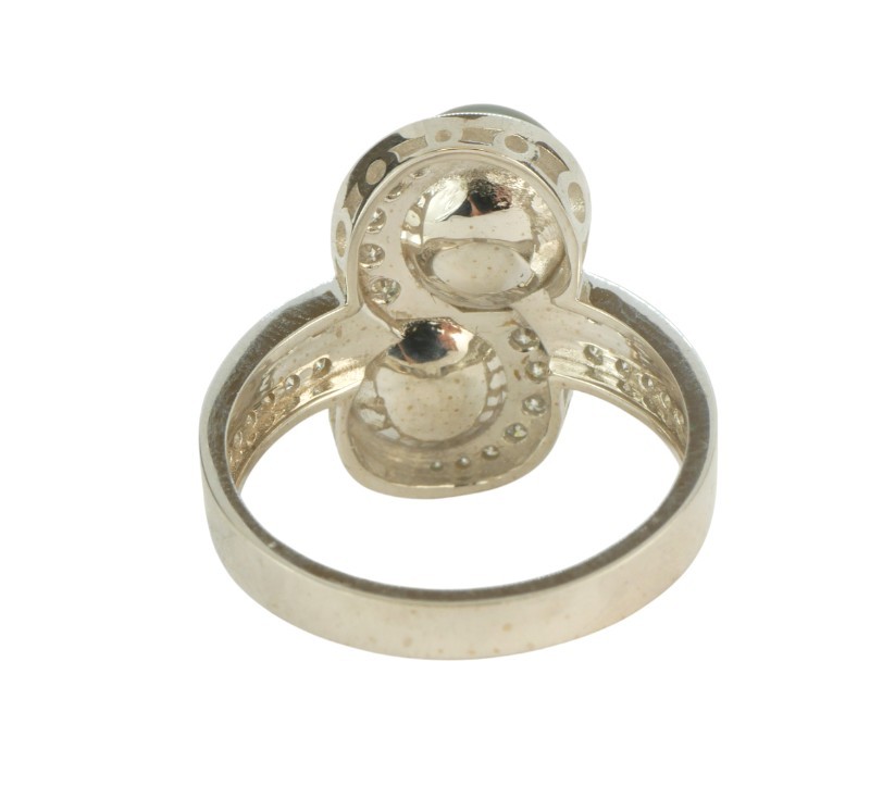 Prsten z bílého zlata ryzosti 585/1000 je zdobený jednou bílou a jednou tahitskou perlou. Dále je osazený drobnými diamanty briliantového brusu o celkové hmotnosti 0,7 ct. Celková hmotnost prstenu je 5,94 g a jeho velikost je 57.