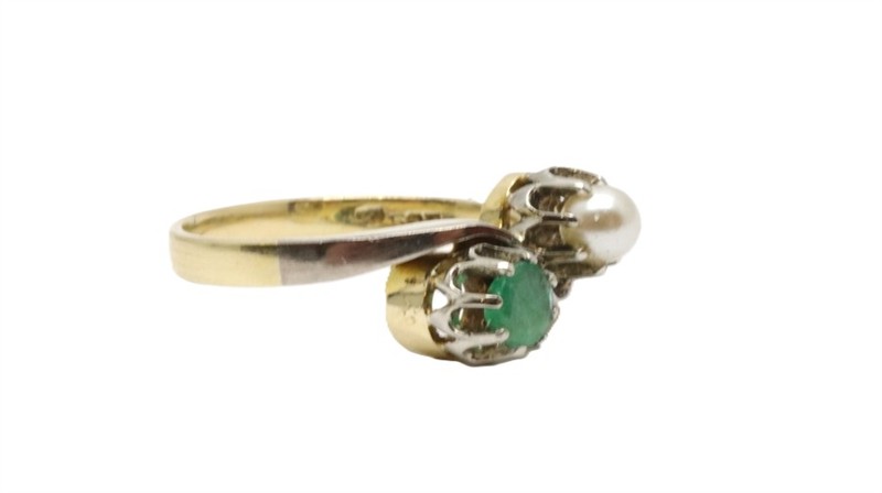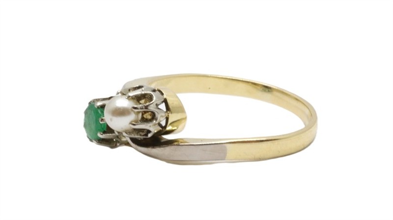 Zlatý prsten s perličkami a rubíny. Žluté a bílé zlato 585/1000. Perlička. Přírodní smaragd 0,25 ct. Váha prstenu: 4,41 g. Velikost prstenu: 61.