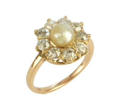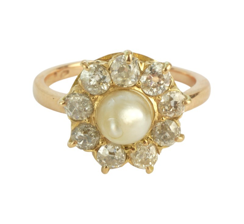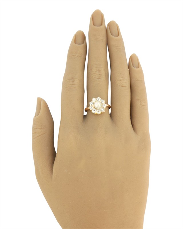 Prsten ze žlutého zlata ryzosti 585/1000 zdobí drobná perla obklopená přírodními diamanty starého briliantového brusu celkové hmotnosti 0,90 ct. Velikost prstenu 55, celková hmotnost 3,97 g.