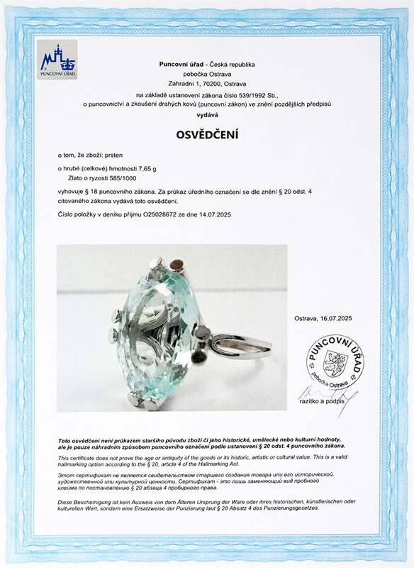 Zlato o ryzosti 585/1000 váha 7,65 g míry kamene 2 x 1,4 cm přírodní akvamarín 1 ks 14,7 ct velikost 52 výborný stav osvědčení puncovního úřadu kameny zkontrolovány v gemologické laboratoři