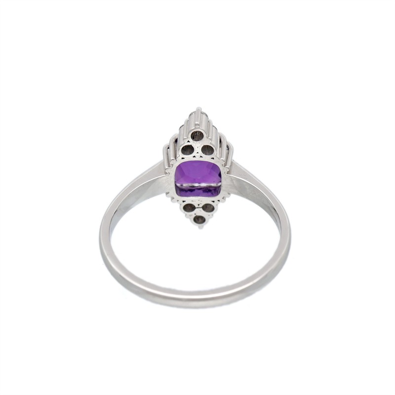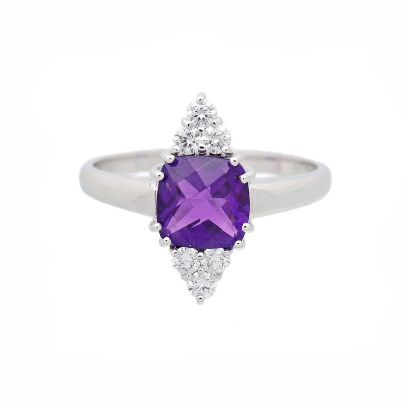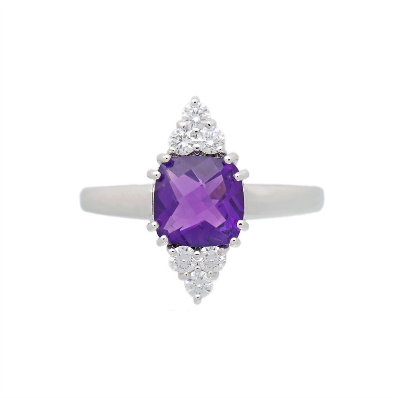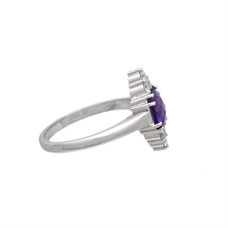 14 karátové bílé zlato 585/1000, celková hmotnost 3,49 g | Přírodní ametyst 1ks: vysoké kvality 1,176 ct | Přírodní diamanty briliantového brusu 6ks: 0,221 ct (bílá barva, VS) | Velikost prstenu 56,5 | Výborný stav, nepoužité | Kameny zkontrolovány v gemologické laboratoři | Přiložen certifikát pravosti ČGL | Zařizujeme veškerý profesionální zlatnický servis - úpravy velikosti, opravy, rhodiování, čištění, výměnu kamenů, znalecké odhady, certifikace a další služby dle vašich potřeb.