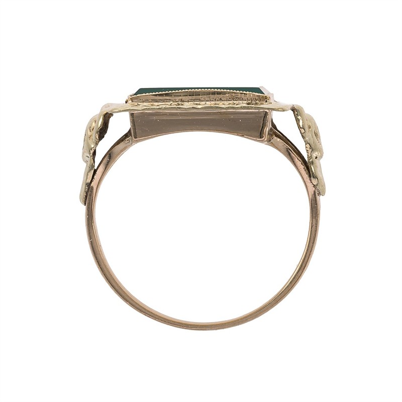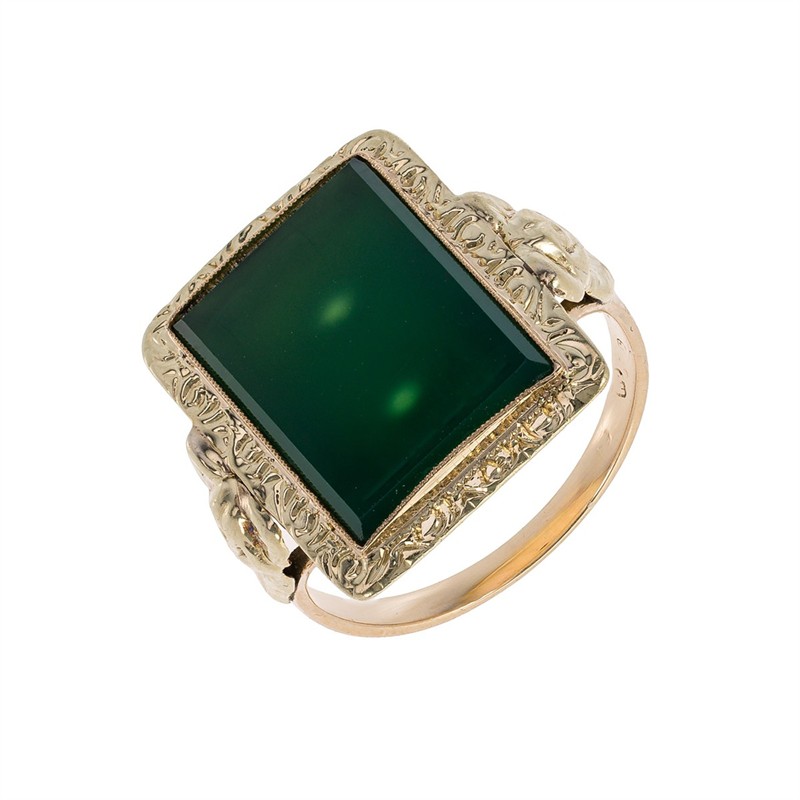 Materiál: žluté zlato o ryzosti 585/1000 Hmotnost: 4,85 g Rozměry: velikost 51, míry hlavy 1,9 × 1,4 cm Drahokamy: -1 ks přírodního barveného chalcedonu Chalcedon je přírodní minerál, jehož barva byla upravena barvením. Stav: výborný