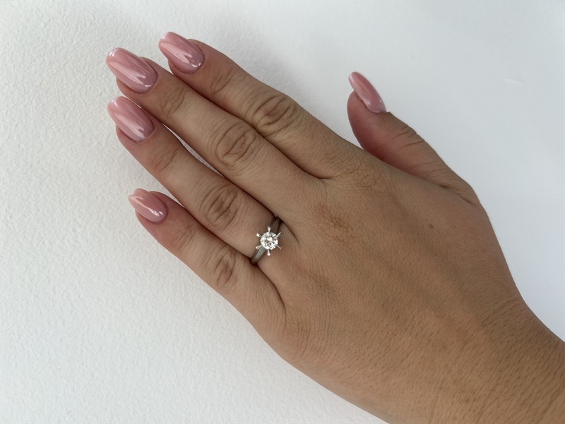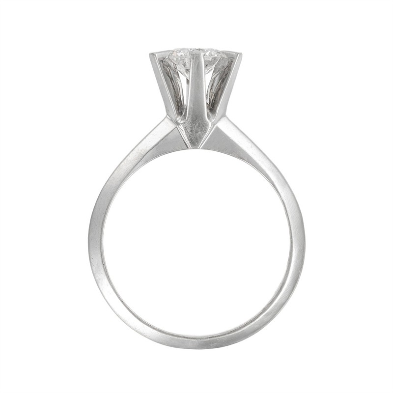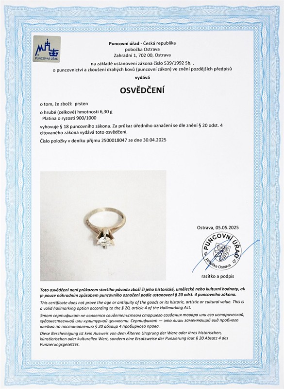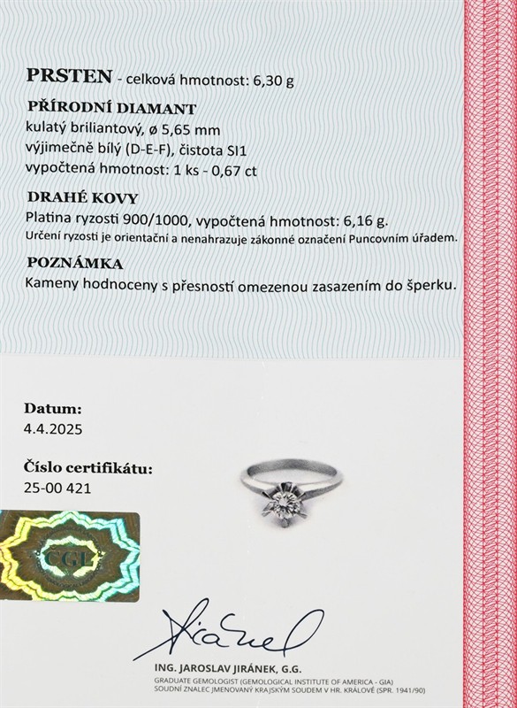 platina o ryzosti 900/1000 váha 6,30 g přírodní diamant 1 ks – 0,67 ct, výjimečně bílý (D-E-F), čistota SI1, průměr 5,65 mm velikost 54 výborný stav osvědčení puncovního úřadu certifikát z gemologické laboratoře je součástí šperku