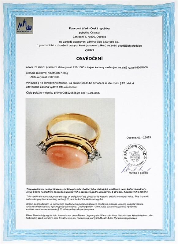 Žluté zlato o ryzosti 750/1000 váha 5,65 g velikost 57 míry hlavy 2,2 x 1,3 cm přírodní korál cca 6,00 ct přírodní diamant 6 ks 0,18 ct výborný stav osvědčení puncovního úřadu kameny s garancí pravosti zkontrolované v gemologické laboratoři