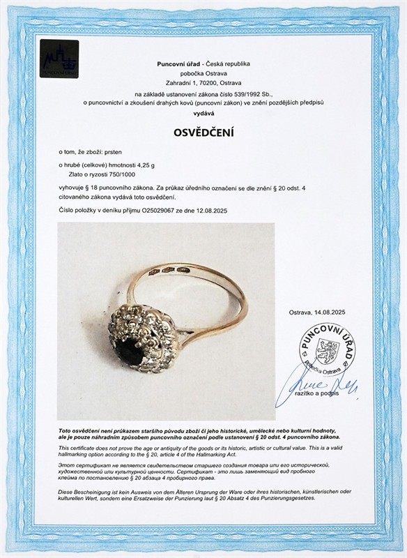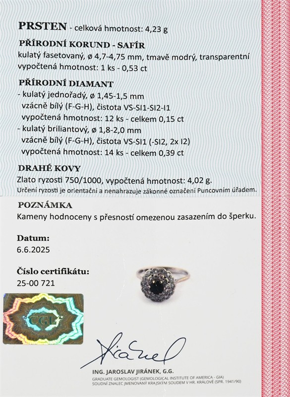Zlato o ryzosti 750/1000 váha 4,25 g průměr hlavy 1,1 cm přírodní safír 1 ks - 0,53 ct, průměr 4,7-4,75 mm přírodní diamanty 1 řada 12 ks - 0,15 ct, vzácně bílý (F-G-H), čistota VS-SI1-SI2-I1 přírodní diamanty 2 řada - 14 ks - 0,39 ct, vzácně bílý (F-G-H), čistota VS-SI1 (-SI2, 2x-I2) velikost 52,5 výborný stav osvědčení puncovního úřadu certifikát z gemologické laboratoře je součástí šperku